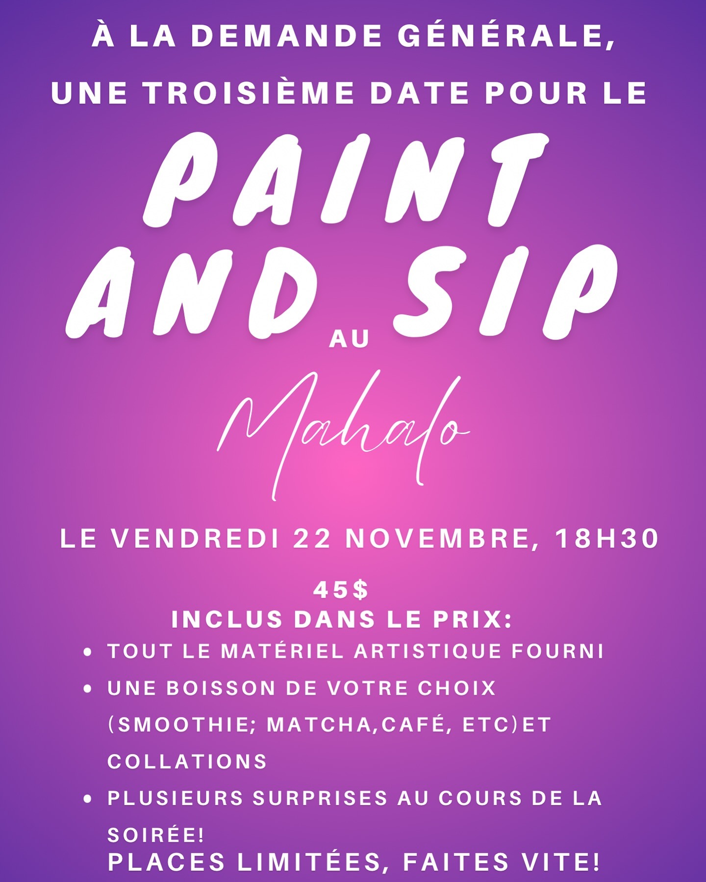 Voici une nouvelle date pour permettre à plus de participants de vivre le Paint & Sip! Venez profiter de cette expérience créative lors de notre troisième journée offerte.